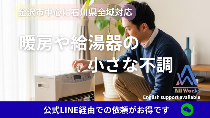 金沢の寒さが深まると、暖房や給湯器の小さな不調が増えてきます。 早めの見直しで冬を安心に。 AllWorksは金沢市中心に石川県全域対応。 LINE写真見積もり&LINEクーポンも使えます。