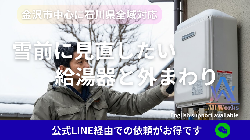 冷え込む金沢の朝は、給湯器の小さな不調が 意外と負担になります。 早めの見直しで冬を安心に。 AllWorksは石川県全域対応、 LINE写真見積もり&クーポンも使えます。